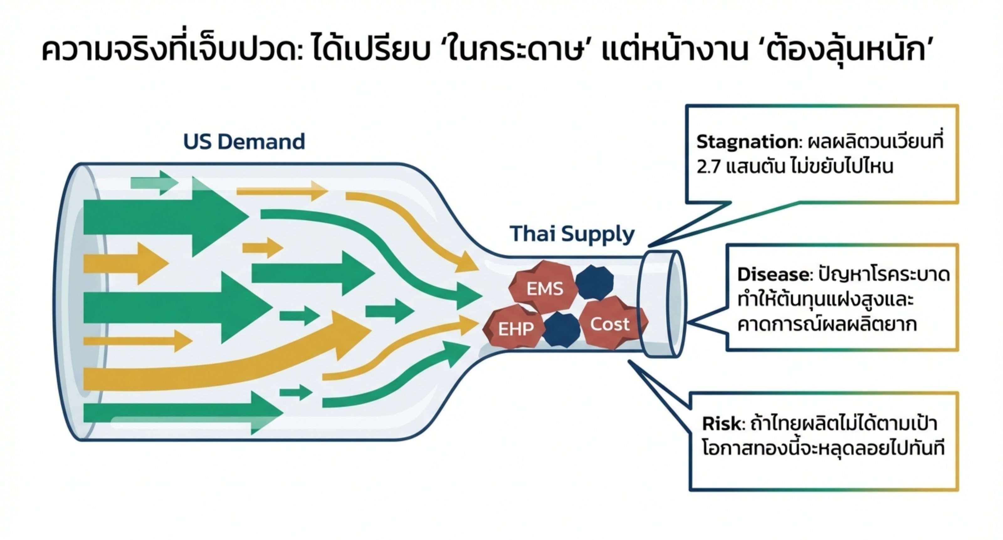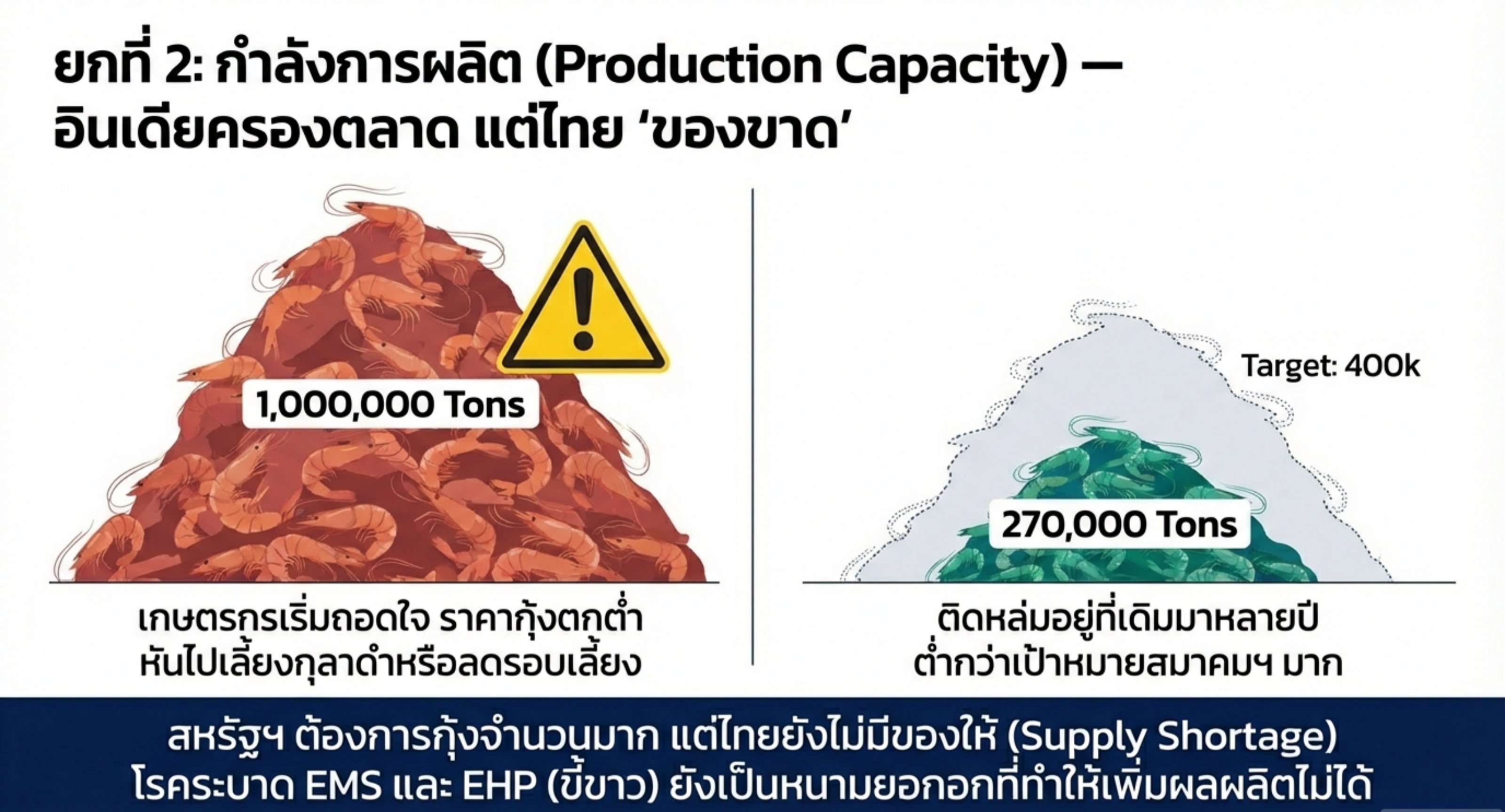 ไทย: นี่คือ ”จุดอ่อน” ที่ใหญ่ที่สุด เรามีโอกาสขาย แต่เรา ”ไม่มีของ” ตัวเลขผลผลิตไทยยังวนเวียนอยู่ที่ระดับ 270000 ตัน/ปี มาหลายปี (ต่ำกว่าเป้าหมาย 400000 ตัน ที่สมาคมฯ ตั้งไว้มาก) โรคระบาดอย่าง EMS และ EHP (ขี้ขาว) ยังคงเป็นหนามยอกอกที่ทำให้ต้นทุนแฝงสูงและผลผลิตไม่แน่นอน