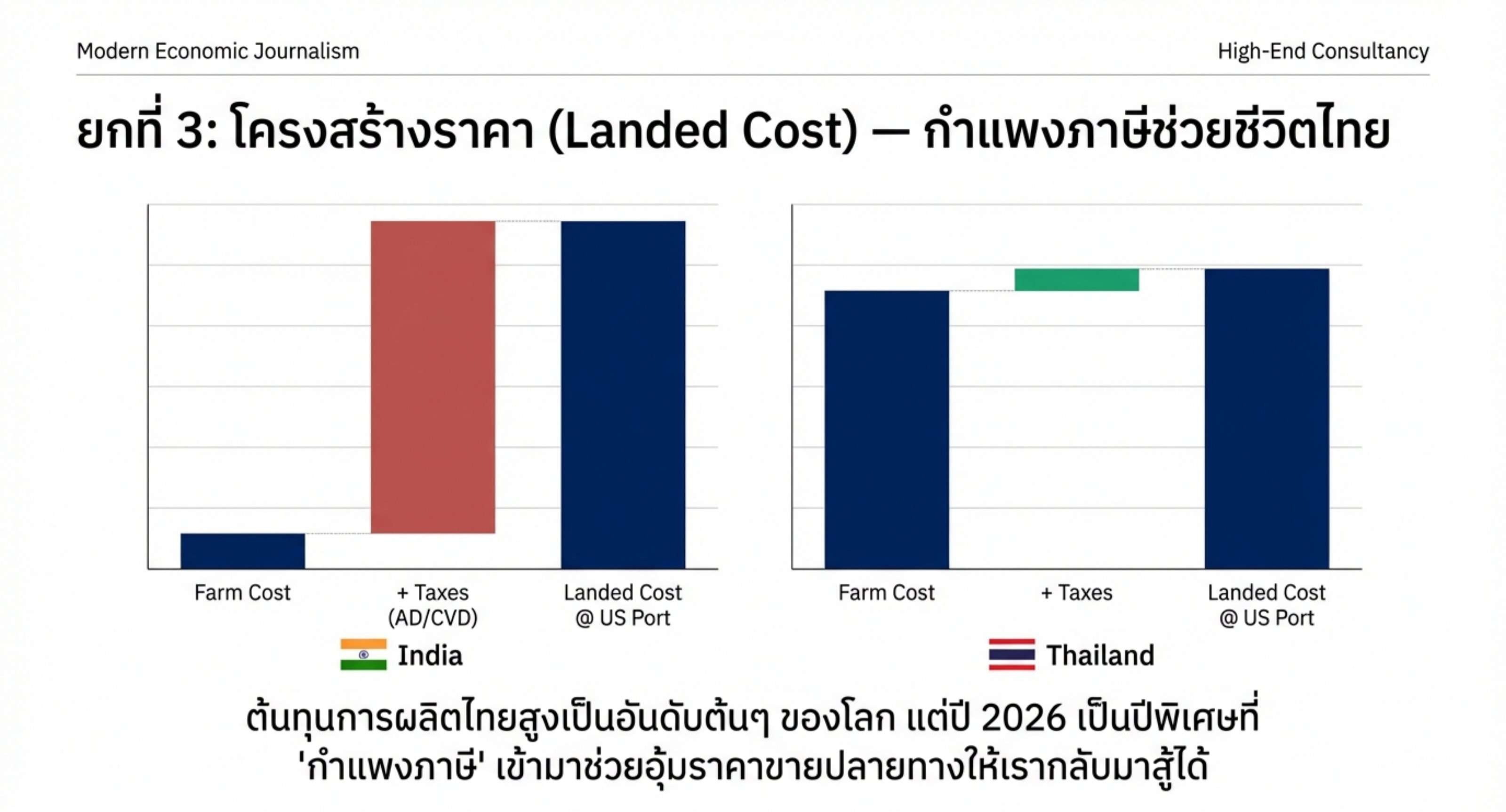 ไทย: ต้นทุนการผลิตเราสูงเป็นอันดับต้นๆ ของโลก (ทั้งค่าไฟ ค่าอาหาร และค่าจัดการโรค) แต่ปี 2026 เป็นปีแปลกประหลาดที่ ”กำแพงภาษีช่วยอุ้มราคาไทยไว้” ทำให้ราคาขายปลายทางของเรากลับมาแข่งขันได้