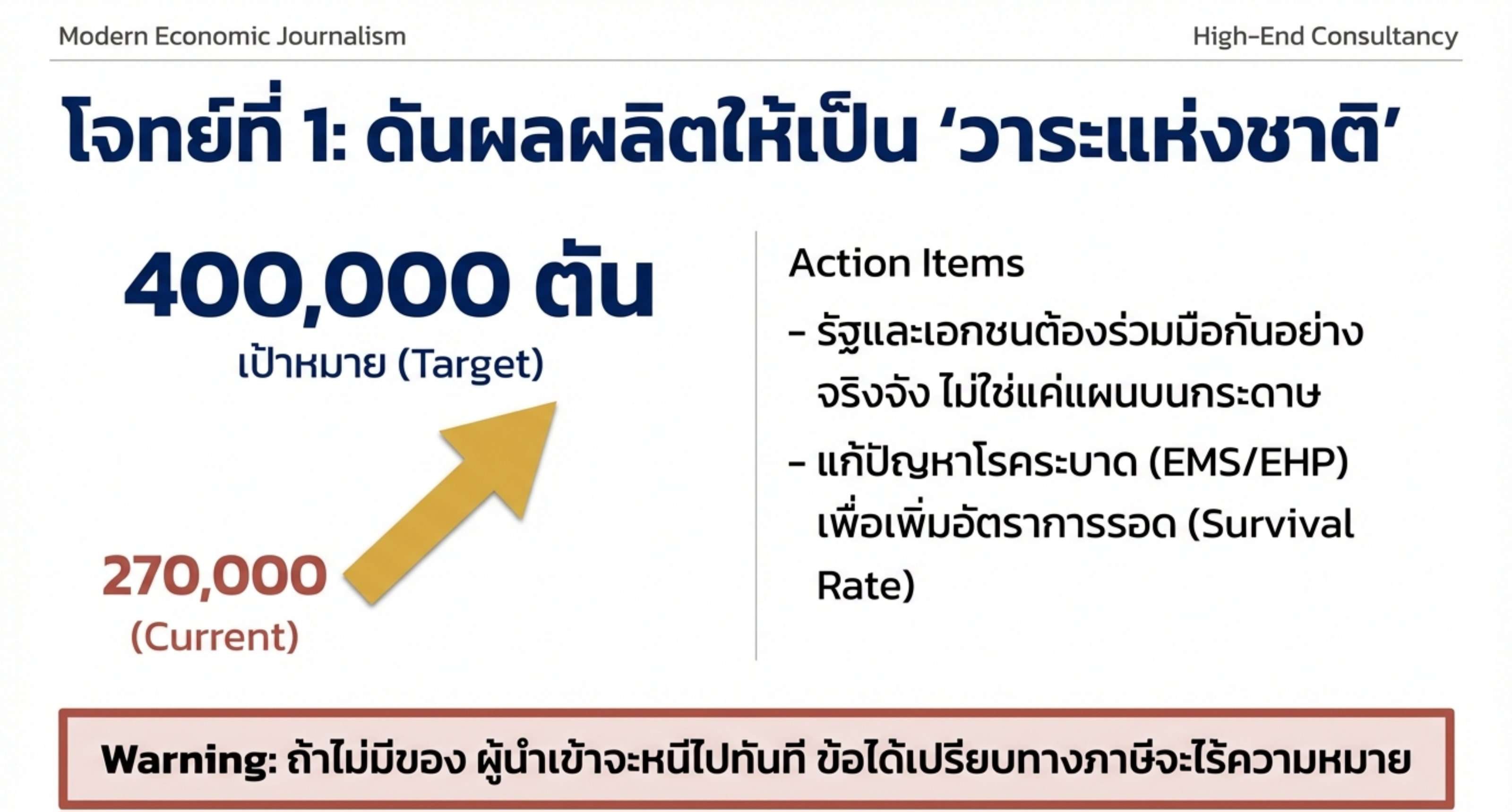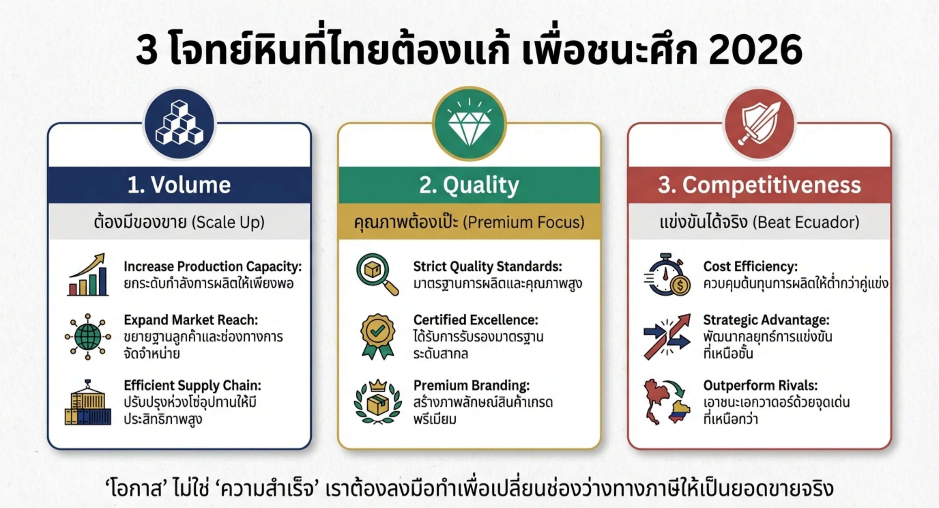 ต้องมีของขาย: รัฐและเอกชนต้องดัน ”วาระแห่งชาติ” ให้เกิดผลจริง ดึงผลผลิตให้แตะ 350000-400000 ตันให้ได้ ถ้าไม่มีของ ผู้นำเข้าจะหนีไปหาเอกวาดอร์ทันที