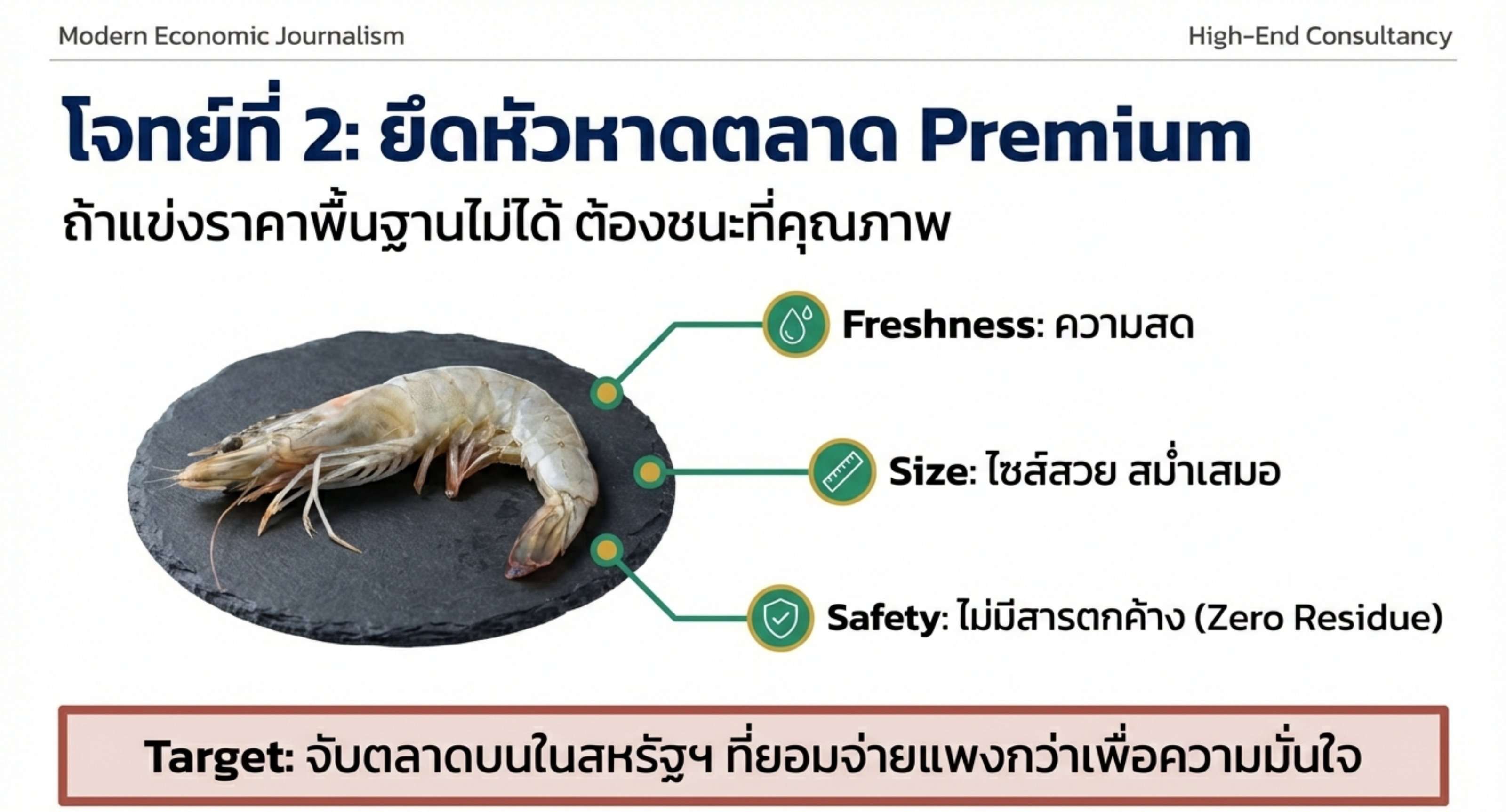 คุณภาพต้องเป๊ะ: จุดขายของไทยคือ Premium Grade ถ้าเราแข่งราคาไม่ได้ เราต้องชนะที่ความสด ไซส์สวย และไม่มีสารตกค้าง เพื่อจับตลาดบนในสหรัฐฯ