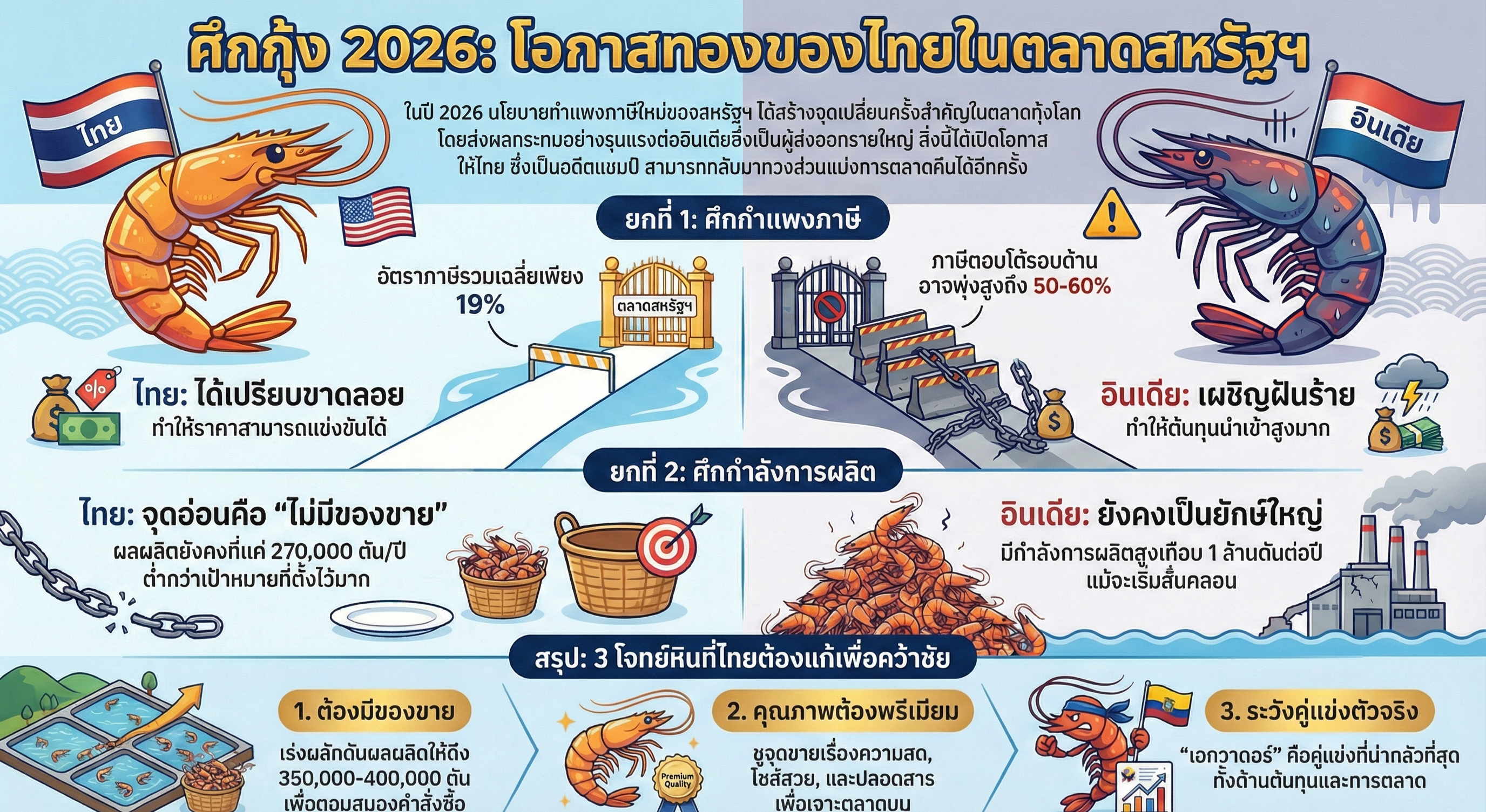 ในปี 2026 ไทยมีความได้เปรียบอินเดียอย่างชัดเจนในตลาดสหรัฐฯ เรื่อง ”ภาษี” ช่องว่างภาษีที่มหาศาลเปิดประตูให้กุ้งไทยกลับไปทวงบัลลังก์ได้ แต่... ”โอกาส” ไม่ใช่ ”ความสำเร็จ”
