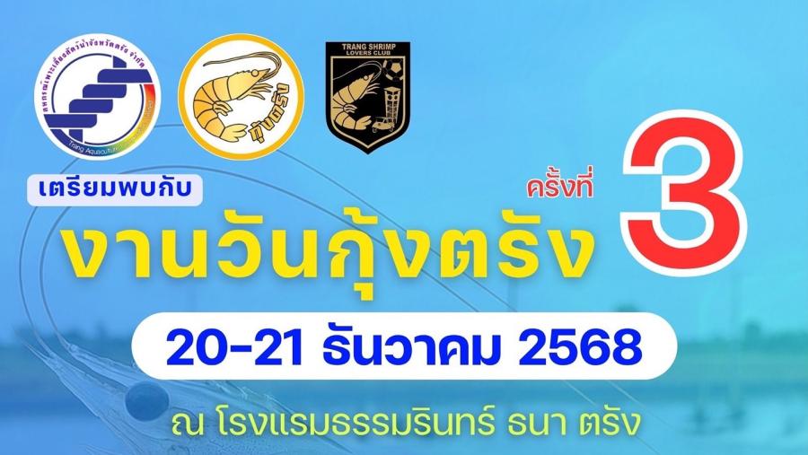 จังหวัดตรัง ศูนย์กลางอุตสาหกรรมกุ้งชั้นนำของไทย จัดงานวันกุ้งตรังครั้งที่ 3 ภายใต้แนวคิด ”กุ้งตรัง พัฒนา ก้าวไกล นำอุตสาหกรรมกุ้งไทย สู่ตลาดโลก” เพื่อเป็นเวทีแลกเปลี่ยนความรู้ทางวิชาการและบูรณาการความร่วมมือระหว่างภาครัฐ เอกชน และเกษตรกร มุ่งยกระดับมาตรฐานการผลิตกุ้งไทยสู่สากล