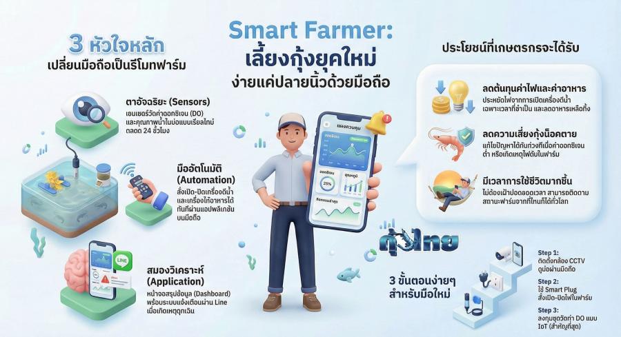 เกษตรกรยุคใหม่ ใช้มือถือเลี้ยงกุ้ง” เป็นแนวทางการบริหารจัดการฟาร์มกุ้งโดยนำเทคโนโลยีสมัยใหม่มาผสมผสาน เพื่อลดความเสี่ยง ลดต้นทุน และเพิ่มความแม่นยำในการเลี้ยง โดยมีโทรศัพท์มือถือเป็นศูนย์กลางในการควบคุมและติดตามผลครับ