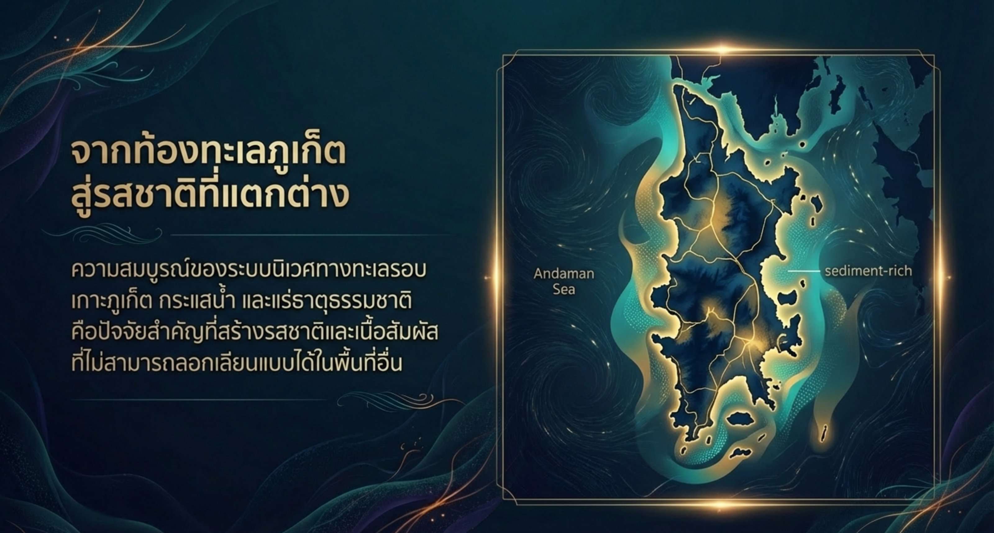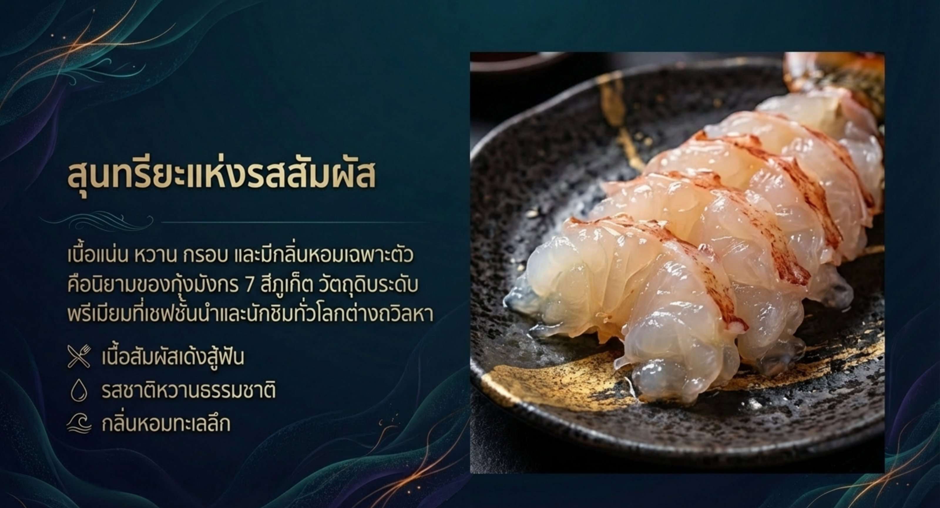 กลิ่นอายเค็มจางๆ ของลมทะเลอันดามันที่พัดผ่านหาดราไวย์ แสงแดดที่ตกกระทบลงบนผิวน้ำสีเทอร์ควอยซ์จนเกิดประกายระยิบระยับ—สำหรับหลายคน นี่คือภาพจำของภูเก็ต แต่สำหรับเหล่านักชิมระดับพรีเมียม ความหรูหราที่แท้จริงกลับซ่อนตัวอยู่ภายใต้เกลียวคลื่น ในรูปของสิ่งมีชีวิตที่มีเฉดสีแพรวพราวราวกับอัญมณีเคลื่อนที่ได้