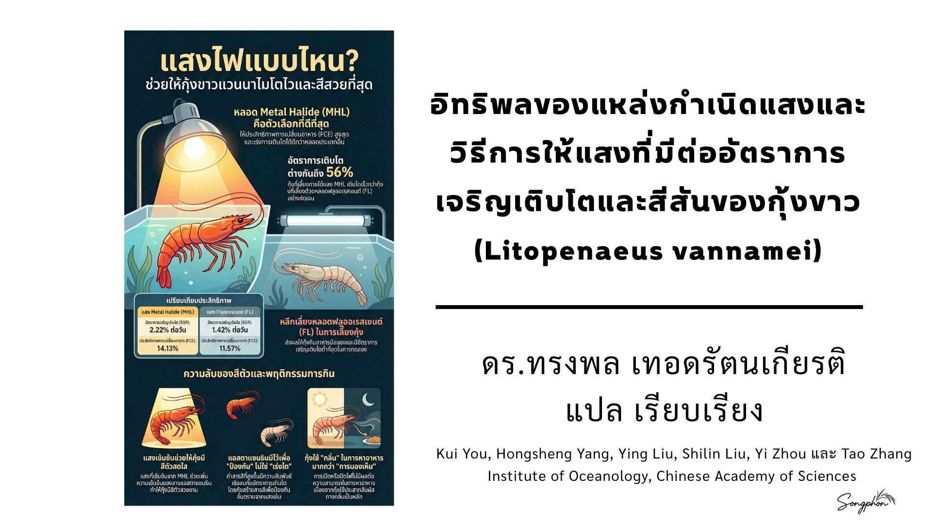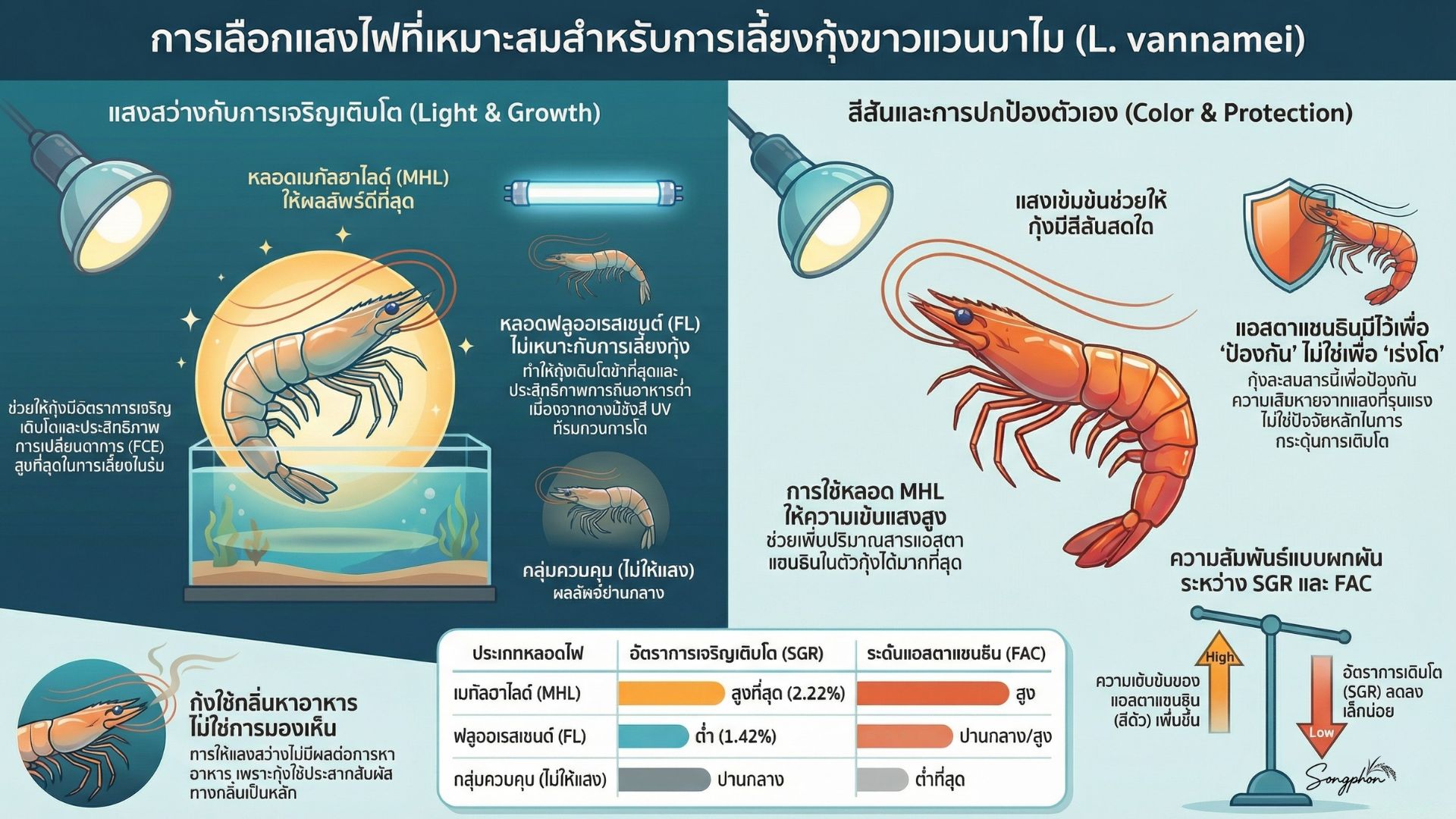 ศึกษาผลของ “ชนิดหลอดไฟ” (หลอดไส้ ฟลูออเรสเซนต์ Metal Halide) และ “ช่วงเวลาการให้แสง” (เฉพาะกลางวัน vs ตลอด 24 ชม.) ต่อการเจริญเติบโตของกุ้งขาว (Litopenaeus vannamei)