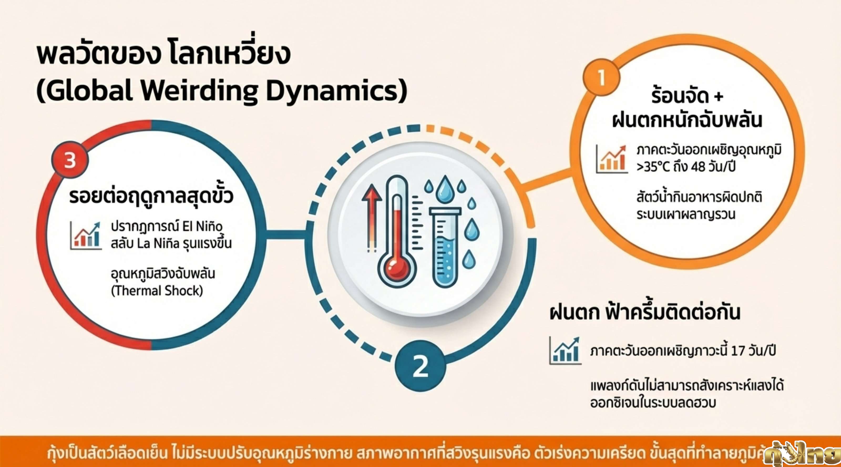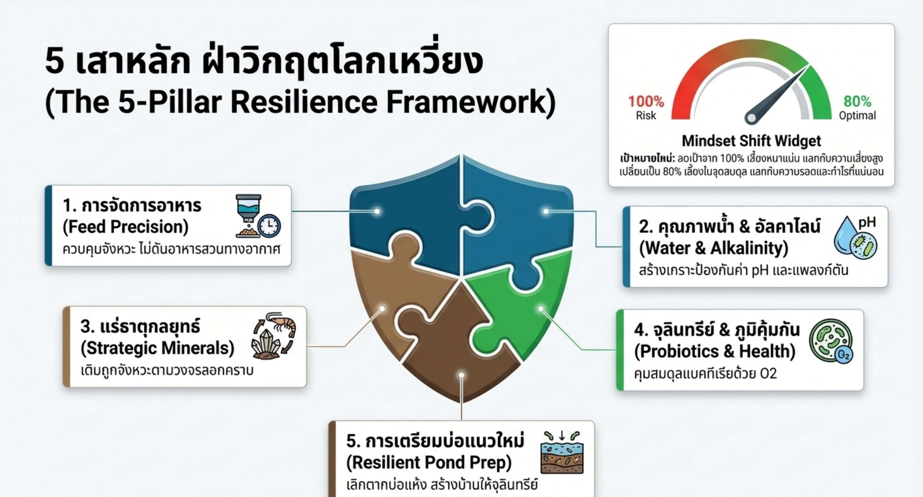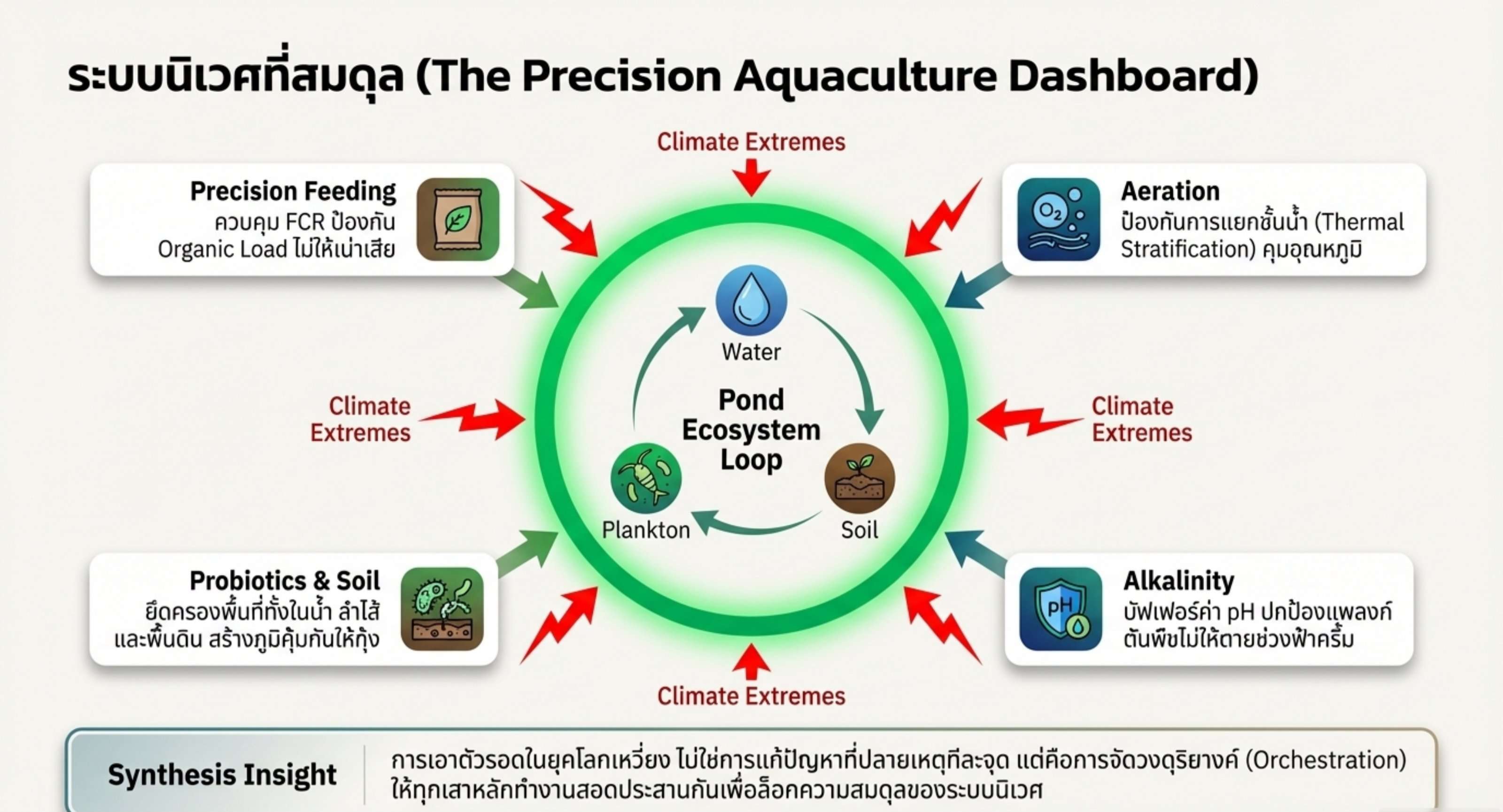 1. เมื่อโลก ”เหวี่ยง” จนศาสตร์การเลี้ยงแบบเดิมใช้ไม่ได้ผล ในแวดวงวาริชศาสตร์ปัจจุบัน เรากำลังเผชิญกับสภาวะ ”โลกเหวี่ยง” (Extreme Weather) หรือความแปรปรวนของสภาพอากาศแบบสุดขั้ว ไม่ว่าจะเป็นความร้อนจัดที่ลากยาว หรือฝนที่ตกลงมาอย่างหนักแบบฉับพลัน สิ่งเหล่านี้ไม่ใช่แค่เรื่องของฟ้าฝน แต่มันคือตัวแปรที่เข้าไปรวนระบบนิเวศในบ่อกุ้งอย่างรุนแรง จนวิธีการจัดการแบบเดิมๆ เริ่มเดินมาถึงทางตัน การจะอยู่รอดในยุคนี้ เกษตรกรต้องขยับฐานะจาก ”คนเลี้ยงกุ้ง” มาเป็น ”ผู้จัดการระบบนิเวศ” ที่เข้าใจกลไกทางเคมีและชีวภาพอย่างลึกซึ้ง และนี่คือ 5 จุดเปลี่ยนสำคัญที่จะเป็นเกราะกำบังให้ฟาร์มของคุณก้าวข้ามวิกฤตนี้ไปได้