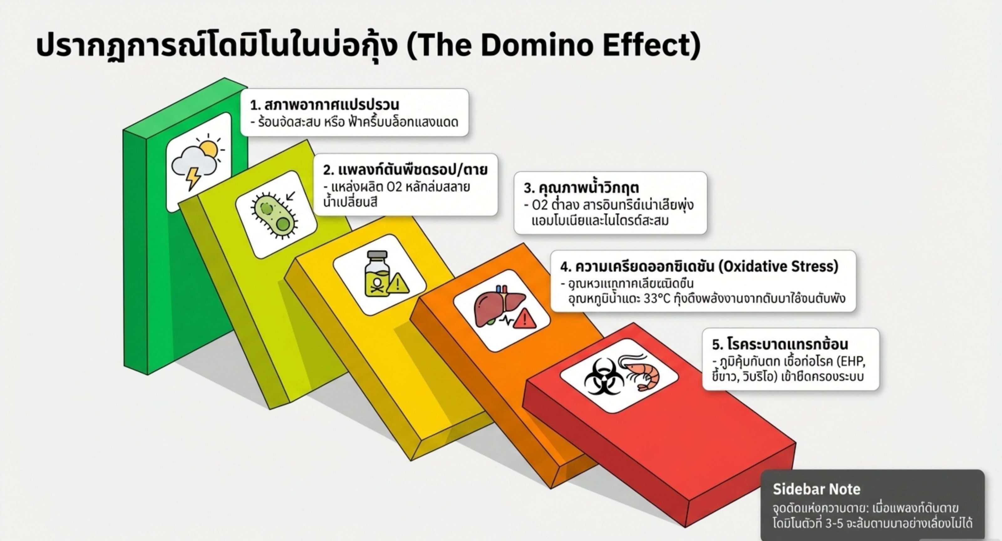 3. ”ไฟโตแพลงก์ตอน” ห้ามตาย: ปรากฏการณ์ Domino Effect ที่ต้องสกัดให้ทัน ในระบบบ่อเลี้ยง ไฟโตแพลงก์ตอนทำหน้าที่เป็นทั้งโรงงานผลิตออกซิเจน ฉากพรางแสงลดความร้อน ตัวหมุนเวียนแร่ธาตุ และอาหารธรรมชาติ กฎเหล็กของโลกเหวี่ยงคือ ”แพลงก์ตอนห้ามดรอป” เพราะหากแพลงก์ตอนตายฉับพลัน จะเกิดผลกระทบลูกโซ่ (Domino Effect): ออกซิเจนหายไป สารอินทรีย์พุ่งสูง และแบคทีเรียก่อโรค (Vibrio) จะเข้ายึดครองพื้นที่ทันที