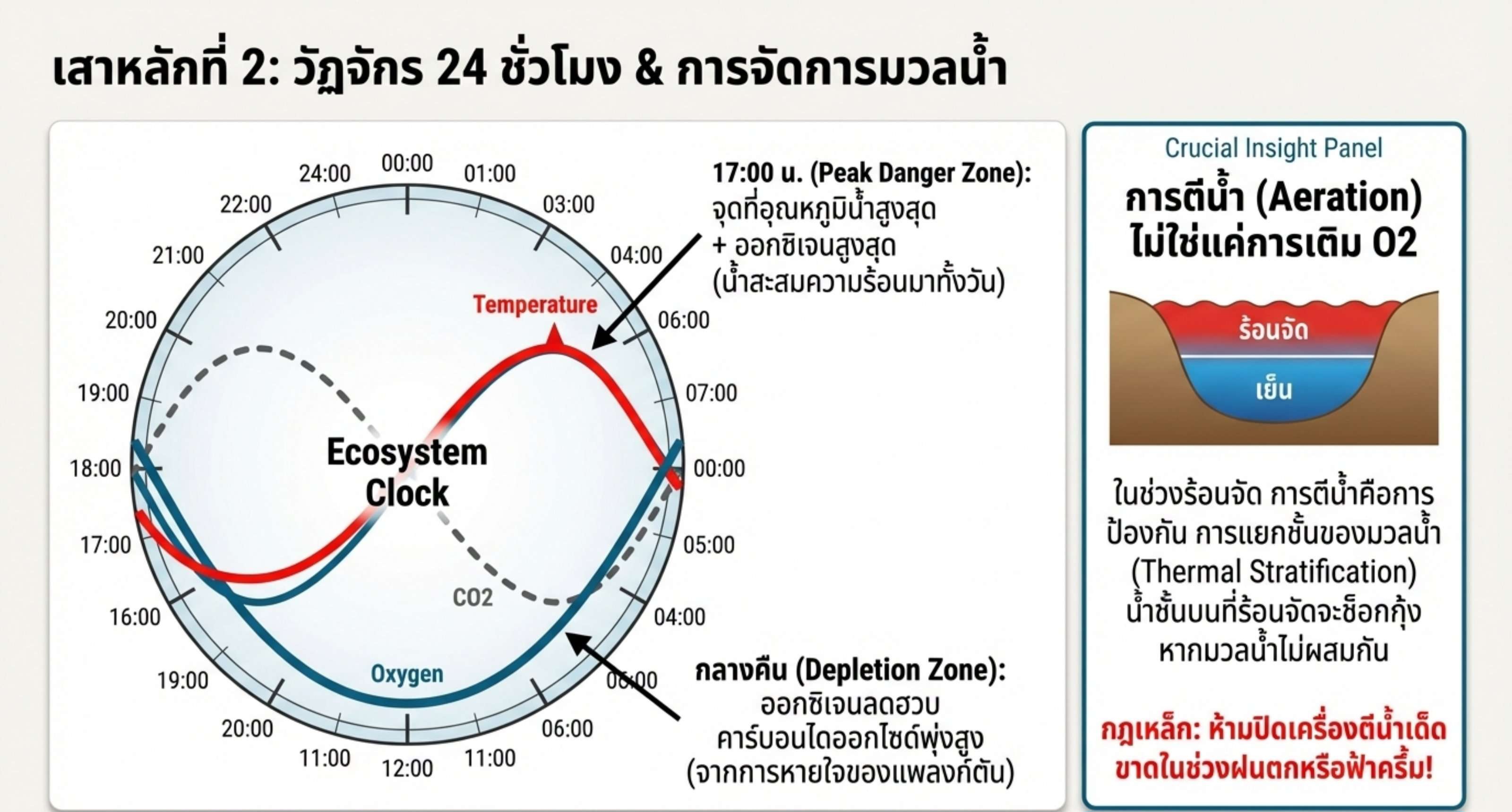 จุดที่อันตรายที่สุดในรอบวันคือเวลา 17:00 น. หรือ 5 โมงเย็น ซึ่งเป็นช่วง ”Triple Threat” หรือวิกฤตสามประสาน เพราะเป็นเวลาที่ อุณหภูมิ ออกซิเจน และค่า pH พุ่งขึ้นสู่จุดสูงสุดพร้อมกัน การสะสมความร้อนจากแดดตลอดทั้งวันทำให้กุ้งเครียดถึงขีดสุด เกษตรกรควรเฝ้าระวังช่วงเวลานี้เป็นพิเศษ
