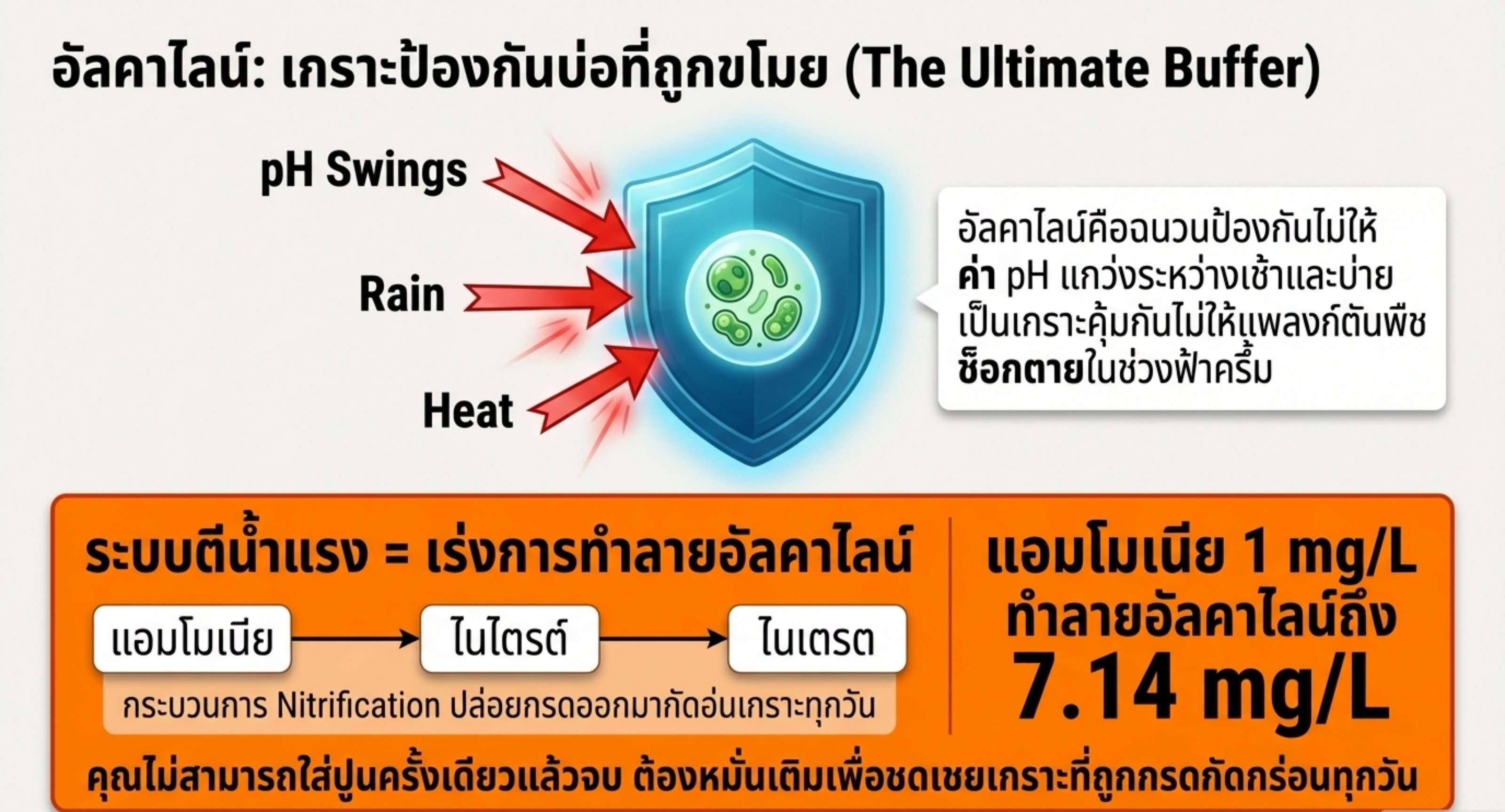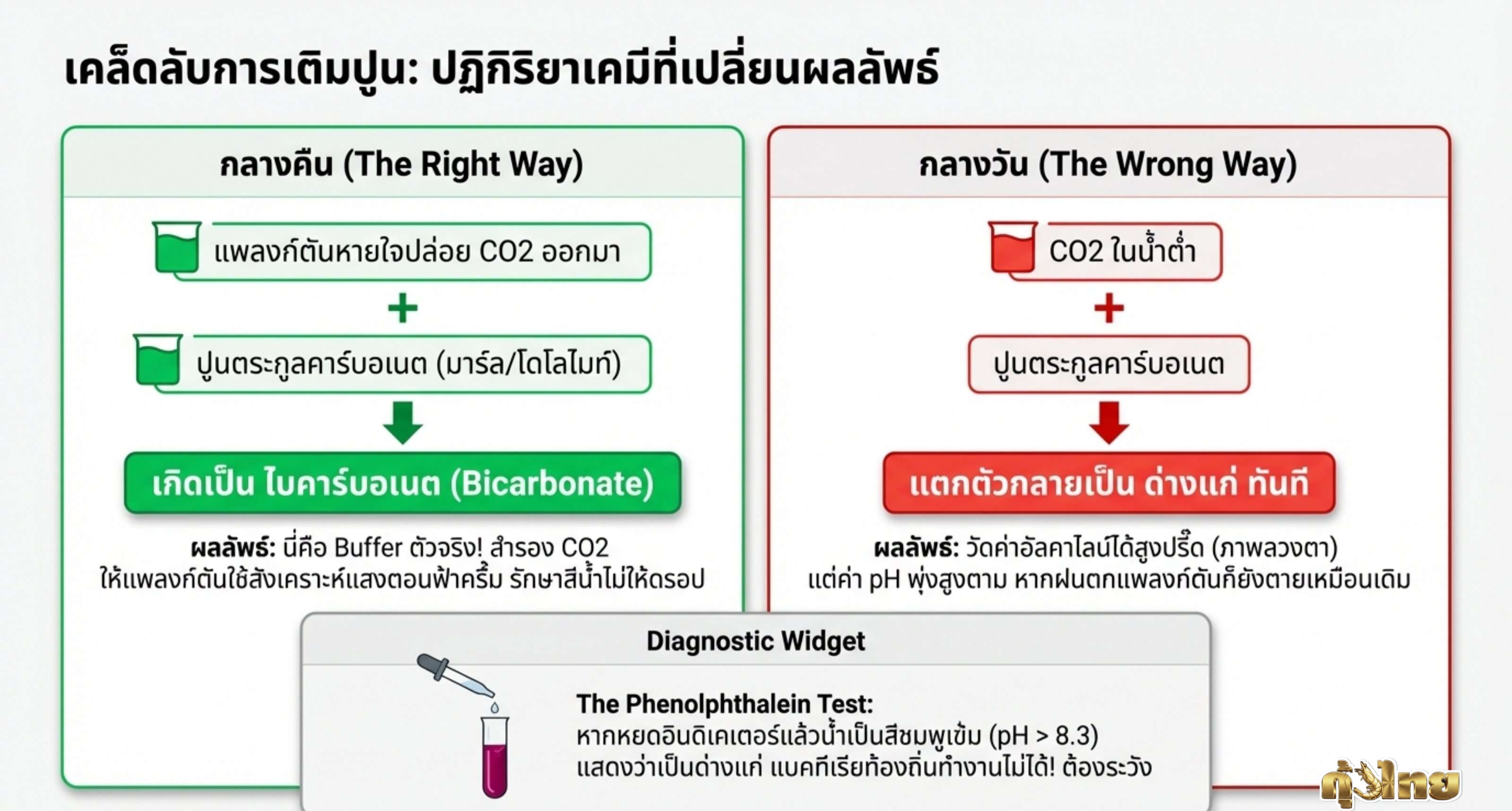 4. ศาสตร์แห่งการคุมอัลคาไลน์: ”สาดปูนตอนละครมา” และความลับของ Bicarbonate ความเข้าใจผิดที่อันตรายที่สุดคือการใส่ปูนตอนกลางวันเพื่อให้ค่าอัลคาไลน์พุ่งสูง ในเชิงเคมีเราต้องการ ไบคาร์บอเนต (Bicarbonate) เป็นบัฟเฟอร์คุม pH แต่การใส่ปูนตระกูลคาร์บอเนต (ปูนมาร์ล หรือ โดโลไมท์) ในตอนกลางวันที่มี pH สูง ปูนจะไม่ละลายและตกตะกอนสูญเปล่า