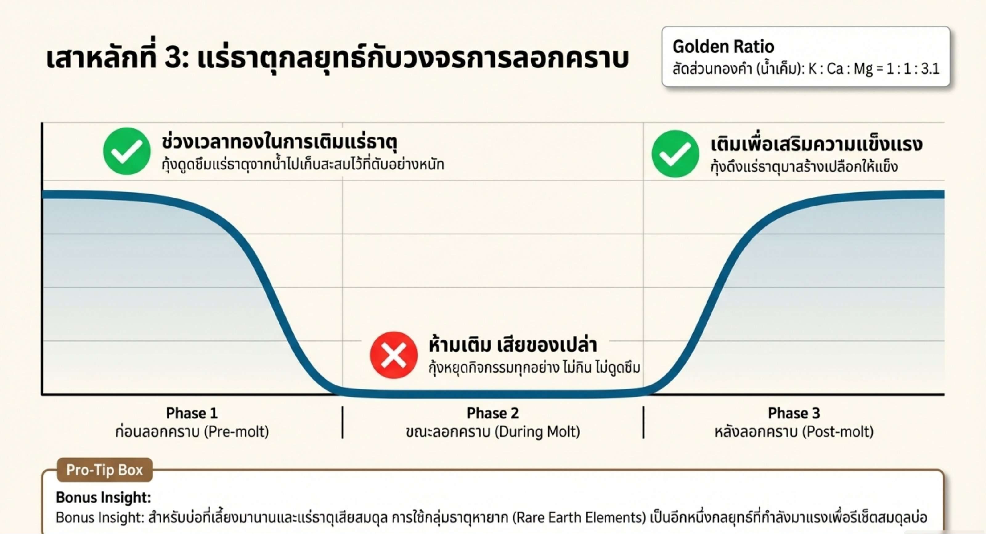 5. แร่ธาตุยุคใหม่: สัดส่วน K:Ca:Mg และกระแส Rare Earth การเลี้ยงกุ้งหนาแน่นในสภาวะโลกเหวี่ยง แร่ธาตุหลักอย่างเดียวไม่เพียงพอ เกษตรกรต้องรักษาความสมดุลของ โพแทสเซียม (K) : แคลเซียม (Ca) : แมกนีเซียม (Mg) ในสัดส่วนประมาณ 1 : 3.5 : 1 โดยเฉพาะในช่วง ”ก่อนและหลังลอกคราบ” ซึ่งกุ้งจะดึงแร่ธาตุจากน้ำเข้าไปสะสมในตับอย่างรวดเร็ว
