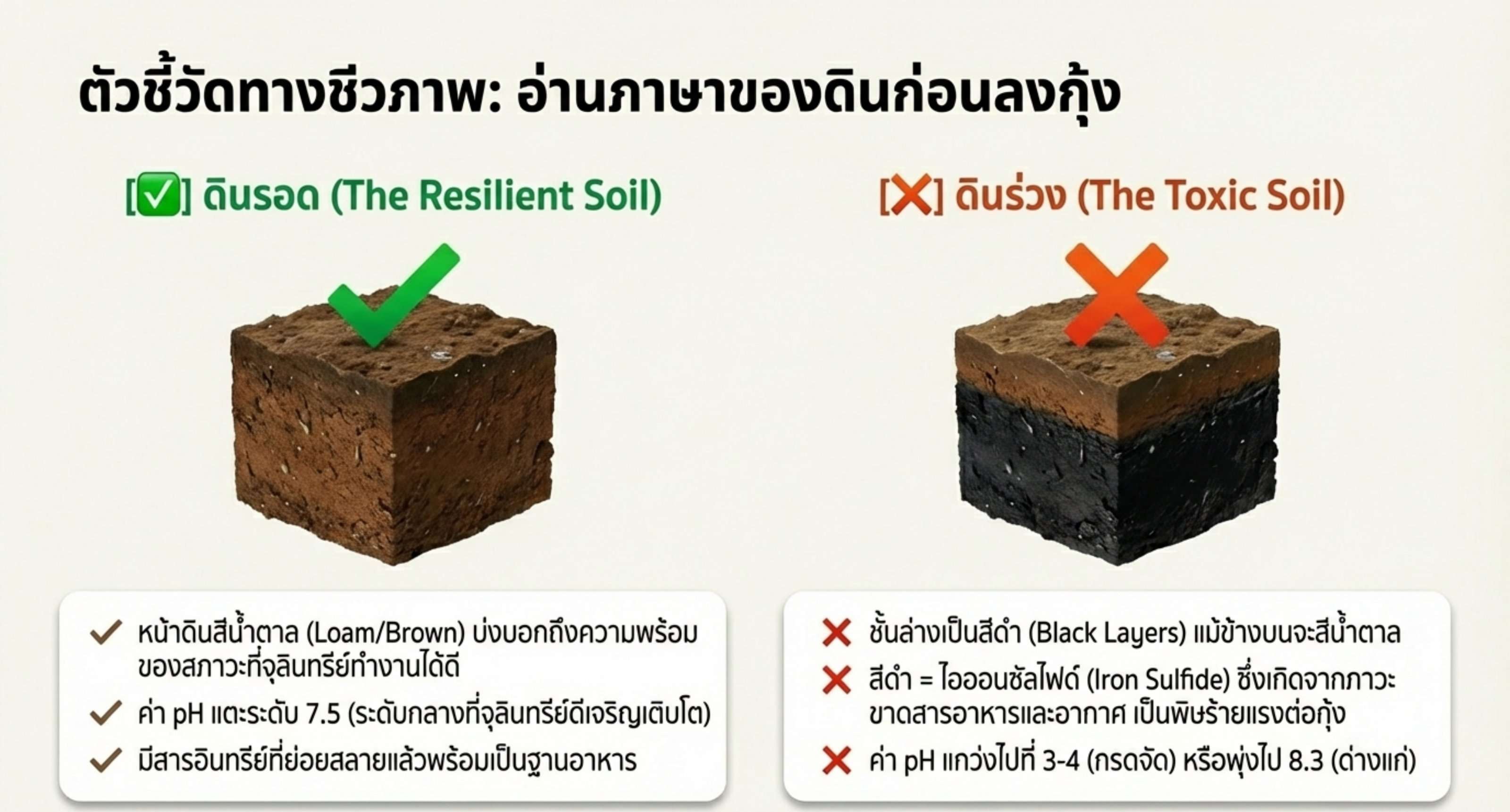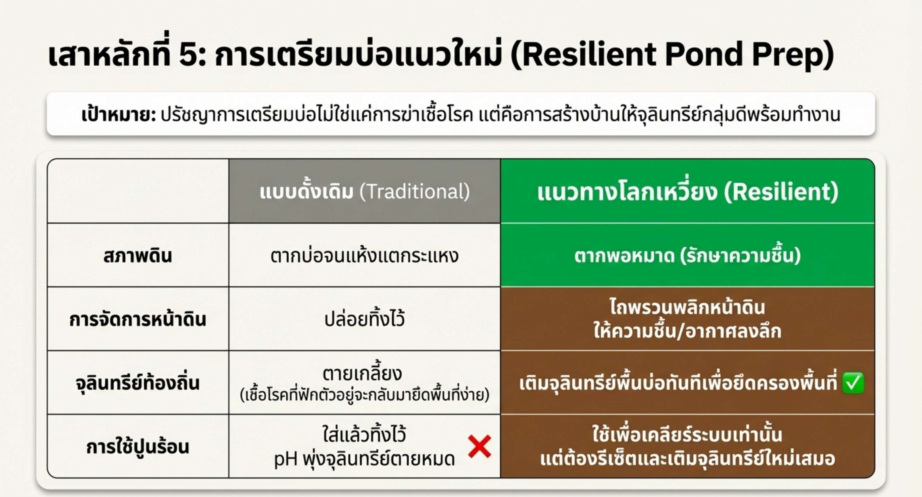 สำหรับการเตรียมบ่อ เลิกตากบ่อจนแห้งแตกระแหงเหมือนทะเลทราย เพราะจุลินทรีย์ที่ดีต้องการความชื้นหมาดๆ และต้องระวัง ”ดินสีดำ” ซึ่งแม้ดินดำจะยังไม่ใช่ก๊าซไฮโดรเจนซัลไฟด์ (H_2S) โดยตรง แต่มันคือแหล่งสะสมของสารซัลไฟด์ที่พร้อมจะเปลี่ยนเป็นก๊าซไข่เน่าที่เข้มข้นและเป็นพิษทันทีหาก pH หรือออกซิเจนในดินลดต่ำลง การเตรียมดินให้มี pH 7.5 และมีออกซิเจนเพียงพอ (สีน้ำตาล) คือรากฐานที่สำคัญที่สุด