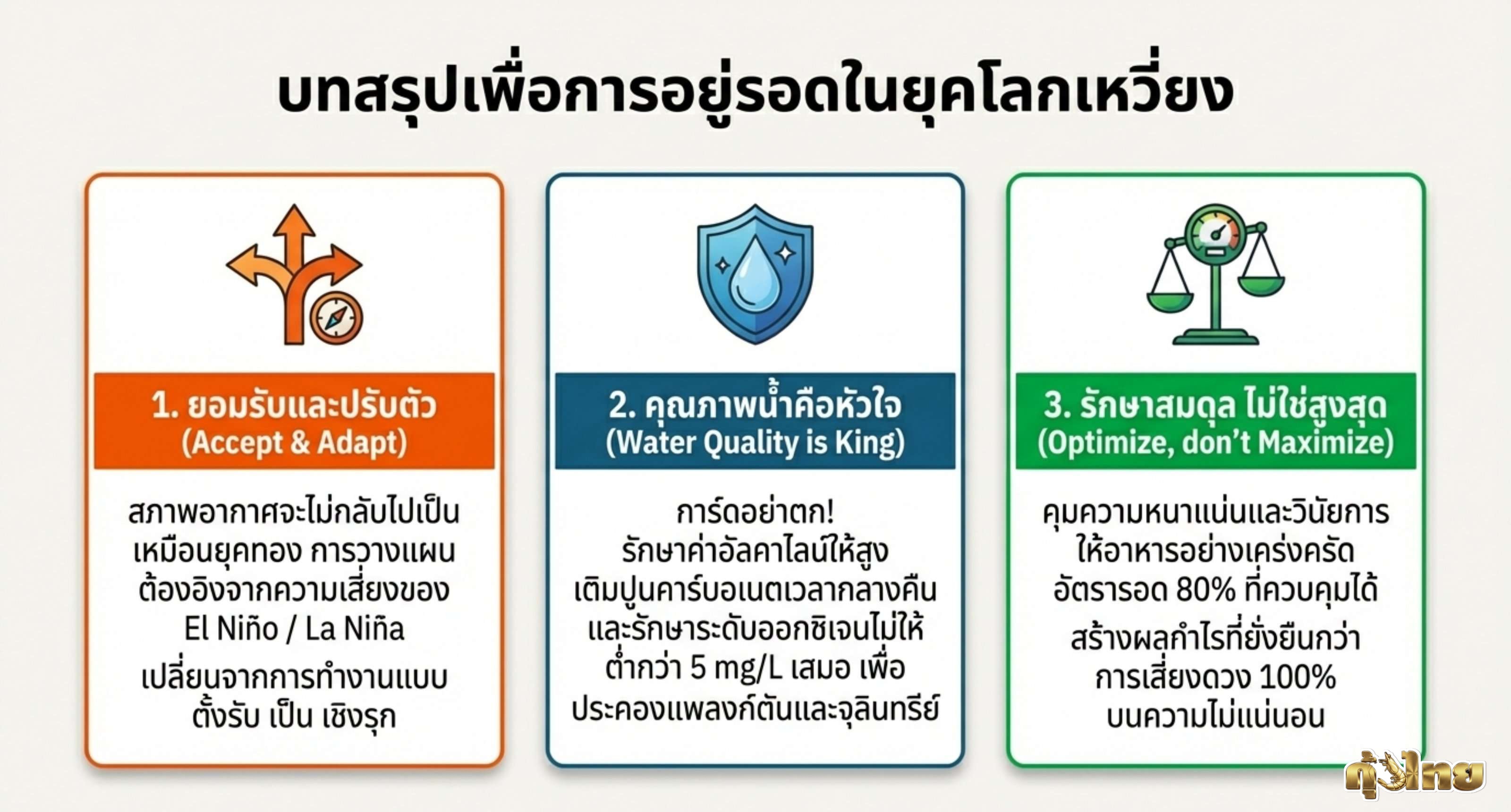 7. บทสรุป: เตรียมรับมือ ”ซูเปอร์เอลนีโญ” และอนาคตกุ้งไทย ในช่วงเดือน มิถุนายน ถึง สิงหาคม นี้ คือหน้าต่างเวลาที่วิกฤต ”ซูเปอร์เอลนีโญ” จะปะทะกับประเทศไทยอย่างเต็มรูปแบบ ซึ่งจะมาพร้อมความร้อนและแล้งจัดที่รุนแรงกว่าทุกปี นี่คือช่วงเวลา ”วัดฝีมือ” ของเกษตรกรไทย